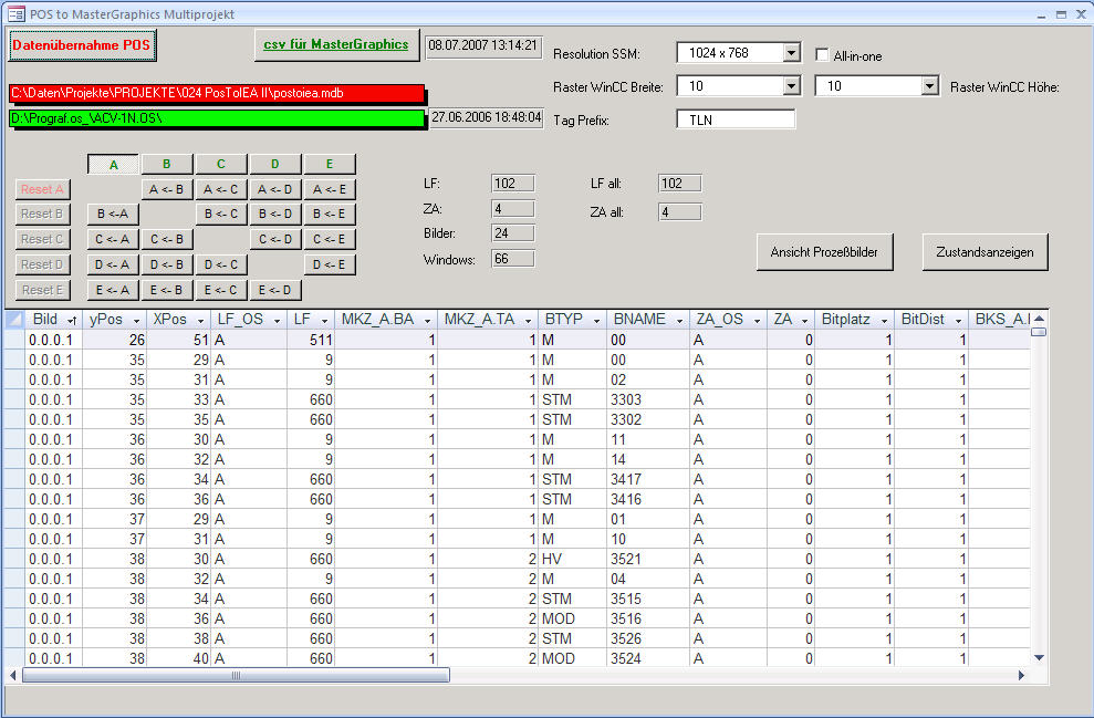 Der wichtigste Gesichtspunkt bei Migrationsprojekten ist die Fragestellung, wie eine Übernahme von Altdaten mit vertretbarem Aufwand bei größtmöglicher Fehlersicherheit zu zu bewerkstelligen ist. Zu diesem Zweck wurde durch uns eine leistungsfähige Datenbankapplikation entwickelt, die die Projektierungsdaten aus dem Altsystemen TELEPERM M OS 2xx übernimmt und automatisch so aufbereitet, das sie mittels der Import - Funktionen der PCS 7 OS direkt in die neuen Prozessbilder übernommen werden können. Die Basis dazu liefert das Projektierungstool TELEPERM M PROGRAF OS. Diese Daten werden ohne Umwege direkt in die ACCESS Datenbank eingelesen. Auf Knopfdruck können dann csv - Dateien generiert werden, die in der PCS 7 OS als Datenbasis für den Import dienen.